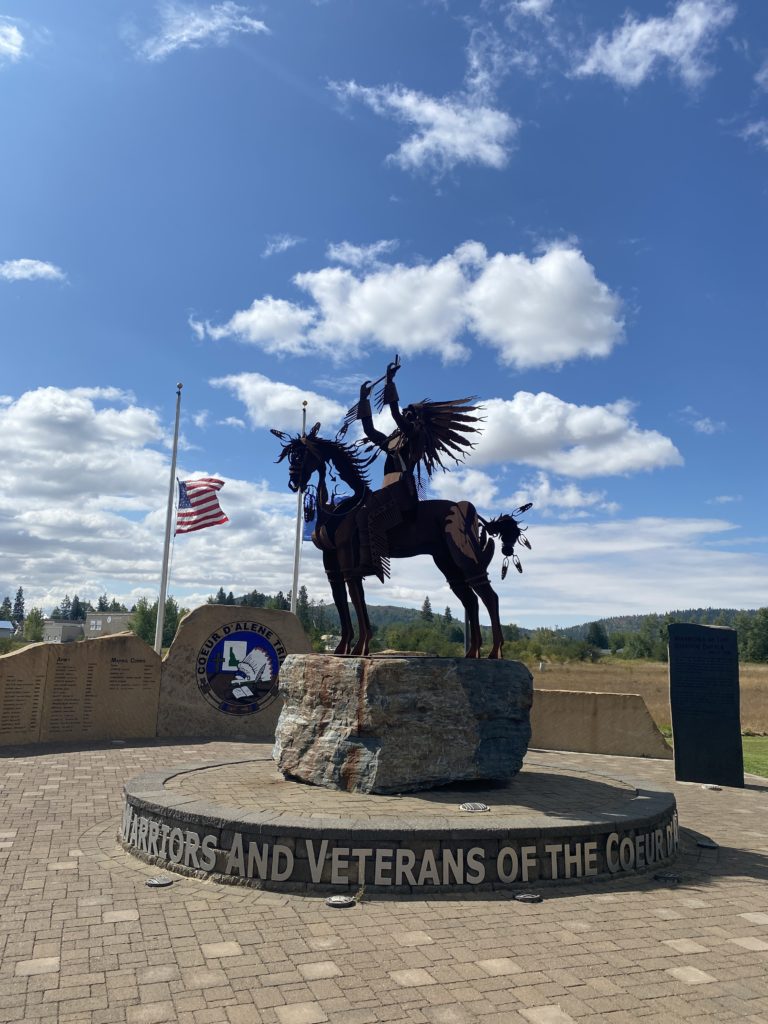 We rolled into Plummer, our turn-around spot. A Native American War Memorial greeted us complete with a large metal sculpture of a warrior on horseback. Very cool. A lady walking her dog was kind enough to take our photo with the sculpture. She said her dog, Tacko, was named for a Navajo phrase meaning “love is in everything.” Geri, who speaks Navajo, didn’t have the heart to tell her there is no such Navajo word ๐