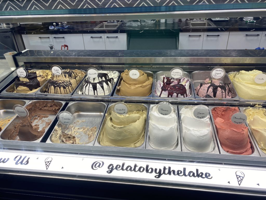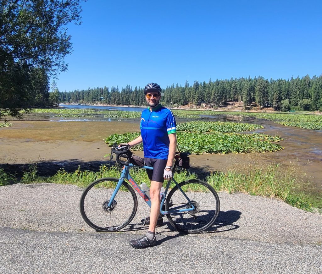 Once we made it to the lake, we were in for some big rollers. Reminded me of Hagg Lake in Hillsboro, but these rollers were much bigger and there were a few longer climbs thrown in for good measure. Emi provided lunch today — chips and sandwiches taste so good after 25 miles on a bike. The biggest rollers and climbs came after lunch, but we were rewarded with some awesome views of the lake. A group of about 20 riders including a tandem passed us going the opposite direction. I wonder if they were doing a private tour like us or if they were a local group out for a day ride.