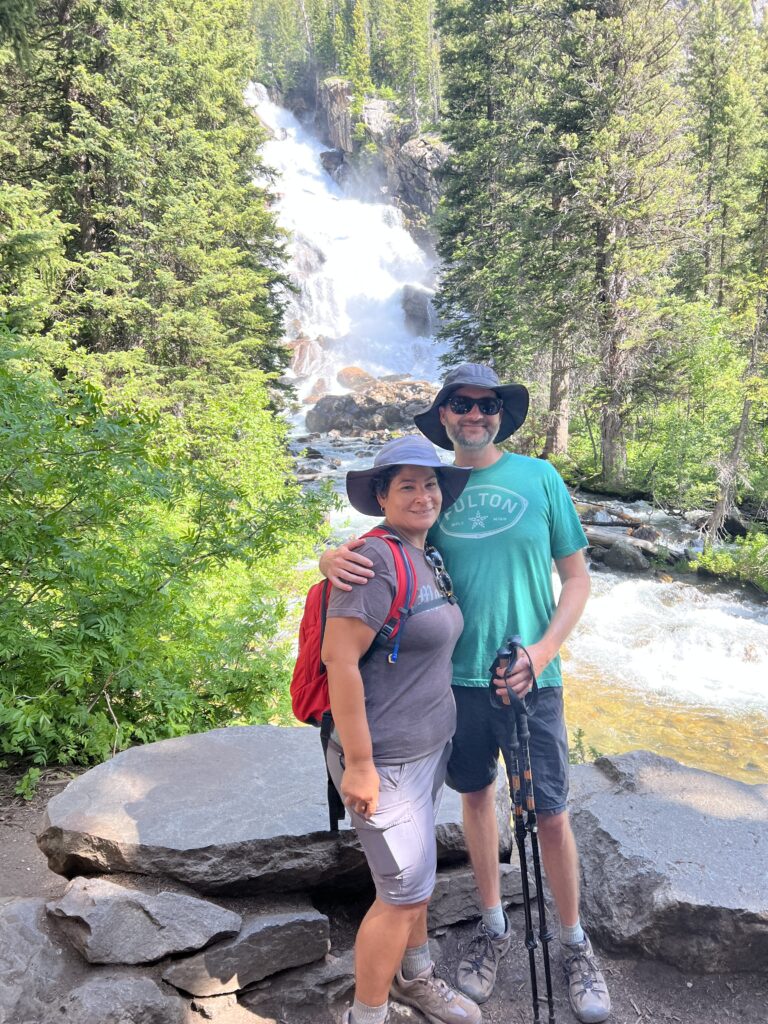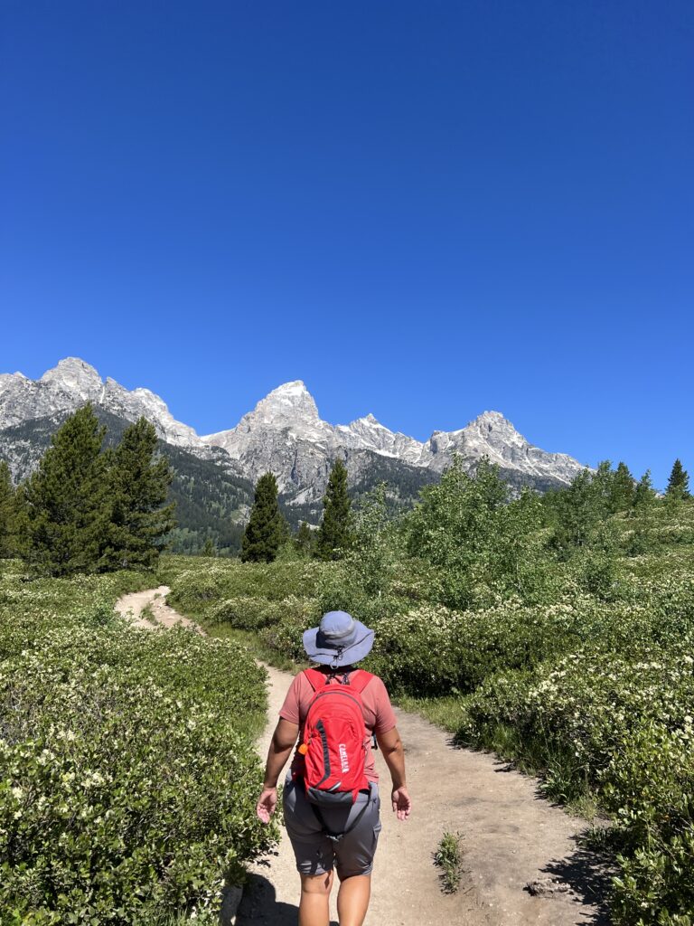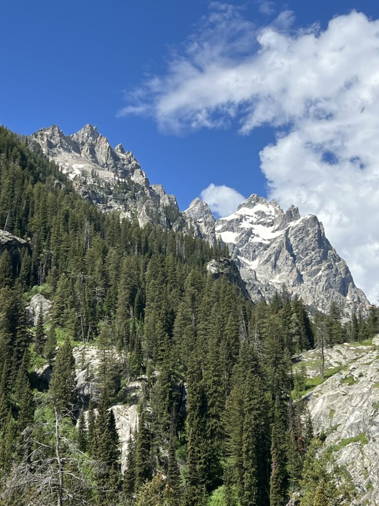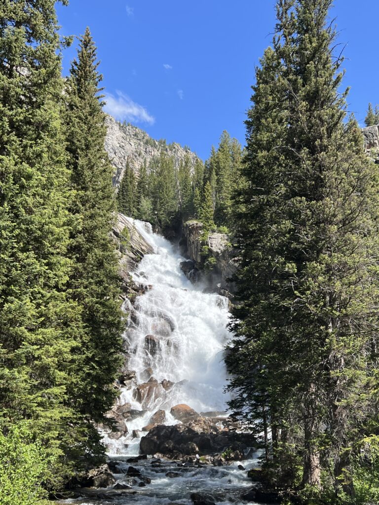 Next, we hiked Jenny Lake. The Jenny Lake area is probably the busiest part of Grand Teton NP. Mostly because of the boat shuttle across the lake to Hidden Falls and Inspiration Point. We did not take the boat, opting to add the 4 miles round trip to our hike. Since the majority of people take the boat shuttle, this part of the trail was very serene with few people. Once we reached the boat drop-off, the trail became a constant stream of people. It was fine though — the falls and Inspiration Point were very scenic and the point made for a great spot for lunch. By the time we made it back to the visitor center, it was warm, so we grabbed some ice cream bars and a bench on the porch in the shade which made for a great finish to our day.