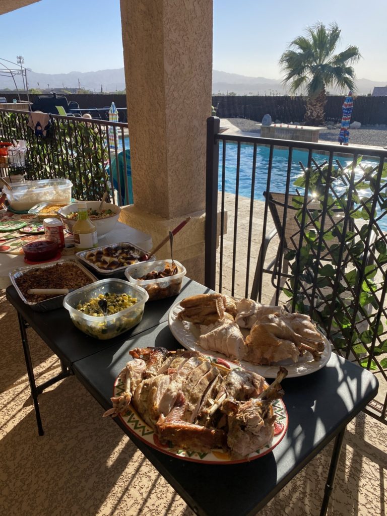 One of the downsides of RV Life is that you can’t always be close to family for holidays. Luckily, we were going to be near an old friend from our Phoenix days who now lives in Lake Havasu City, Arizona. Tyler and his wife Trish were very nice and allowed us to crash their Thanksgiving 🙂 We had a great time — they put out quite the spread. We rolled into town the day before Thanksgiving. Our first challenge was finding water to fill our fresh tank. We are so used to the Northwest where potable water is plentiful and everywhere. Not so much in the desert. We had to pay $15 at the State Park to gain access to their potable water station. Tyler had a spot at the lower level of his property that was level enough to park our trailer. Lake Havasu City is very hilly and our parking spot was a very rocky dirt pad. I almost got the truck stuck but then realized we have 4 wheel drive 🙂 Pulled back on to the road, shifted into 4 wheel drive, and gave it another go. This time worked out much better and we were able to get the trailer into the space. Whew. After a grocery run, it was time to relax and drink beers 🙂