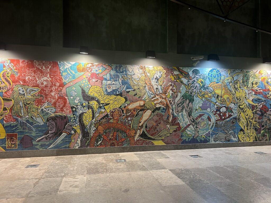 After the Cascais day, we did a city walk-about, exploring more parts of the Portuguese capitol. We visited Castelo de Sao Jorge, the National Pantheon, and stumbled upon a vintage street market. One of my favorite things about travel is not the planned itinerary and the “must-see” places, but what you discover along the way. The vintage market, known as the Mercado de Santa Clara, happens every Tuesday and Saturday. The American Pickers would have a blast here 🙂 One of the streets of the market has a beautiful tile mural along a retaining wall.